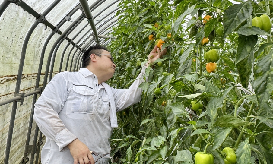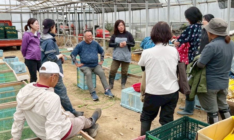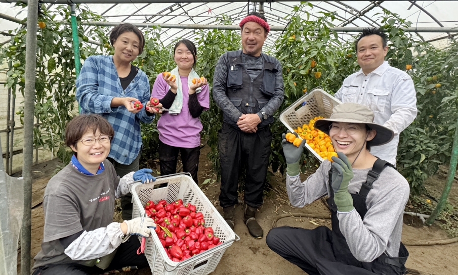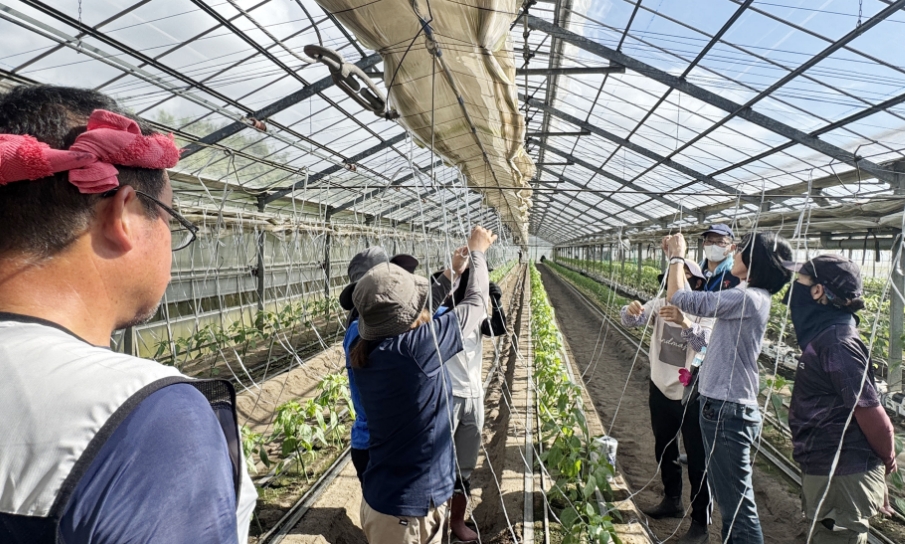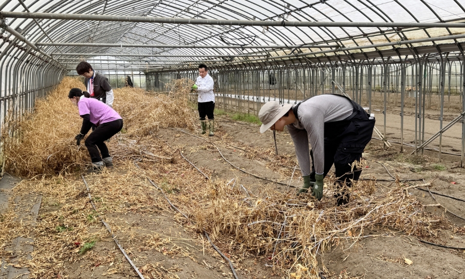 伊藤昌美さんのあっぴいちゃんFarmに訪問し、多岐にわたる事業内容について説明をいただきました。同ファームでは、ピーマンを通年で栽培するほか、冬場にはリーフレタス、スティックブロッコリー、小松菜など多様な品目を生産されています。今回の実地研修は、ピーマンの生育を支える「糸の誘引作業」から、収穫が終了したハウスでの「枯れ木の撤収作業」まで、ピーマン栽培の一連の作業を実践的に学びました。さらに、リーフレタス畑ではマルチ張りの作業、ミニパプリカの収穫作業にも取り組みました。また、伊藤さんがチューリップ実行委員会の会長を務めていることから、地域貢献活動についても深く理解。小学校の子どもたちへの食育を目的としたさつまいも収穫体験のための準備作業も行い、生産だけでなく、地域との連携や教育的役割についても学ぶことができました。