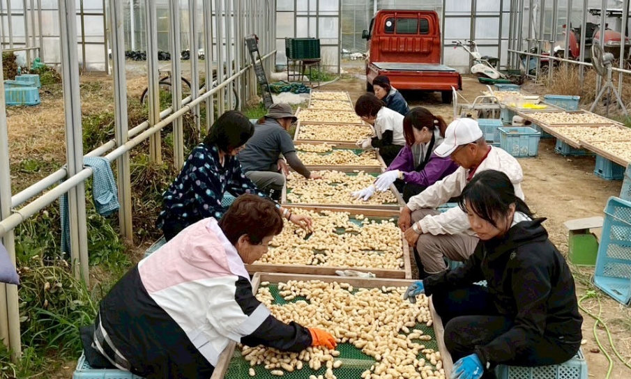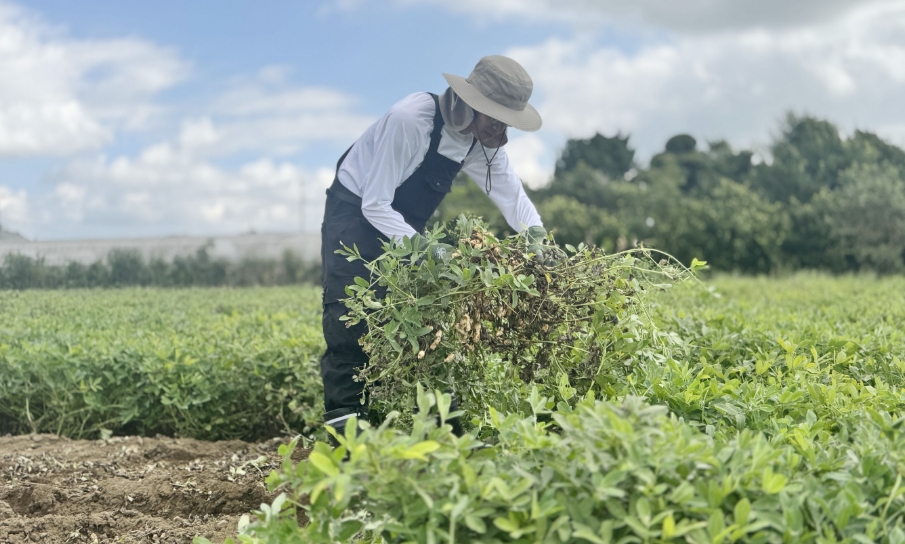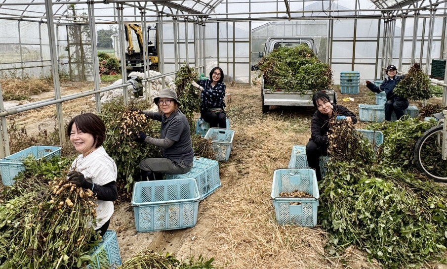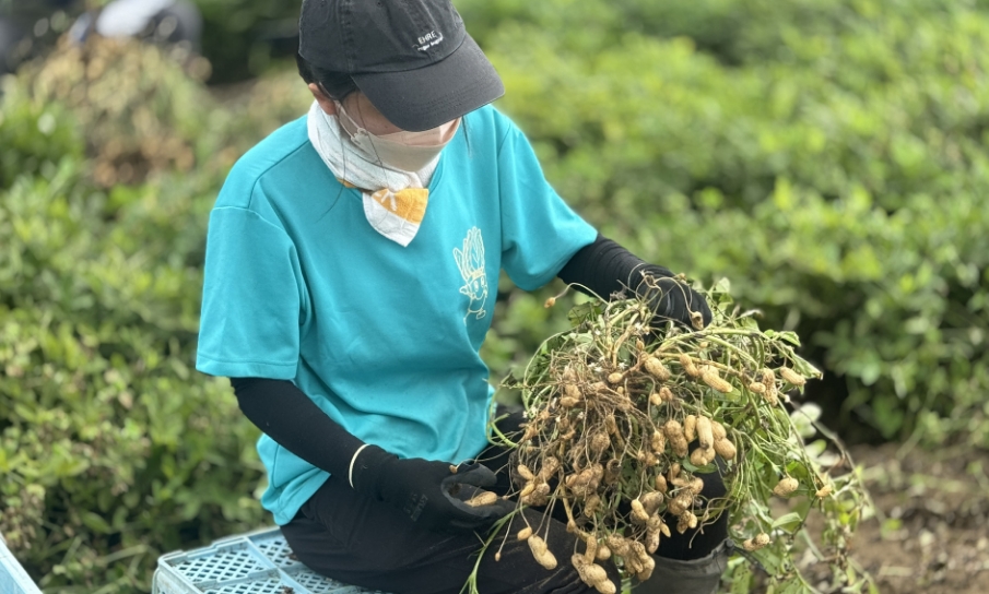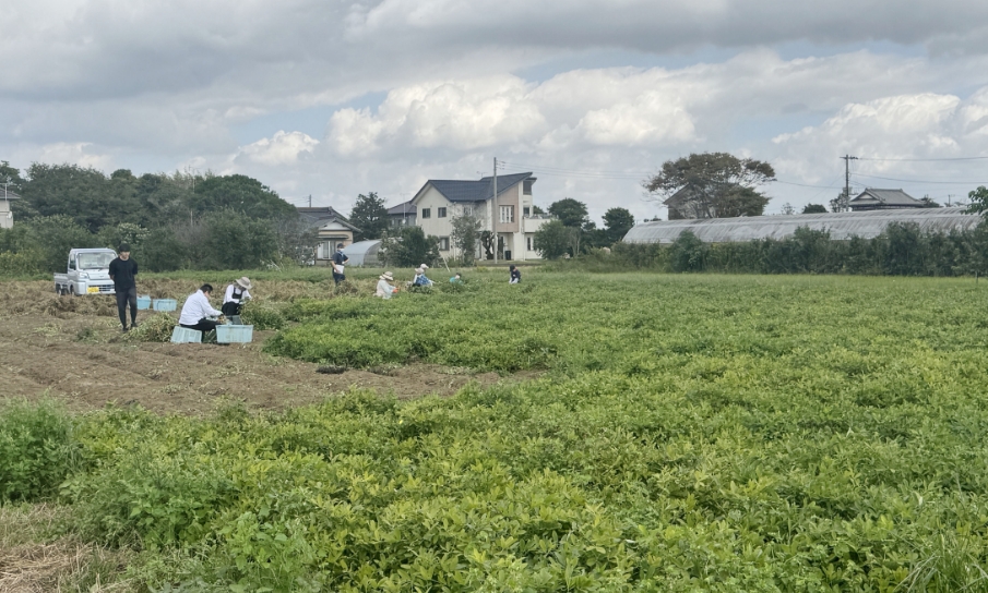 佐瀬ファームの佐瀬洋樹さんの圃場を訪問し、落花生について学びました。座学では、落花生の品種特性、最適な栽培期間、掘り取りのタイミングなど、高品質な落花生を育てるための専門知識をご指導いただきました。圃場にて収穫作業を実践。土の中から落花生の房を掘り上げ、適切な成熟度を見極めるポイントを学びました。収穫後の集荷場では、市場に出すための丁寧な選果作業、そして出荷に向けたパッケージング作業に至るまで、一連のプロセスを体験しました。作業の合間に設けられた休憩時間では、佐瀬さんのご家族や従業員の方々と膝を突き合わせて意見交換を行うことができました。農業経営への考え方や地域での暮らしなど、多岐にわたるテーマで活発な交流ができ、専門的な学びだけでなく、人の温もりを感じる有意義な研修となりました。
