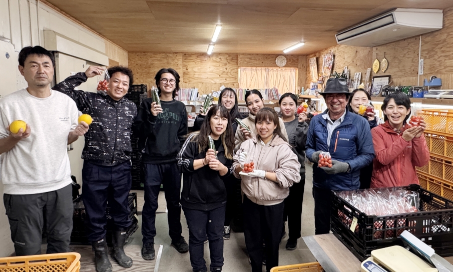 2日目は「PENTA FARM」の山内氏のもとで、イチジクとブドウの農作業研修に挑みました 。イチジクの研修では、繊細な果実の収穫から出荷の段取り、さらには地元の人気産直「周ちゃん広場」での陳列までを一貫して体験 。生産者がどのようなこだわりを持って品質を管理し、消費者の手元に届くまでの付加価値を創出しているかを学びました 。午後のブドウ収穫研修を通じ、果樹農業におけるスピード感と丁寧な手仕事の両立の重要性を実感した1日となりました 。