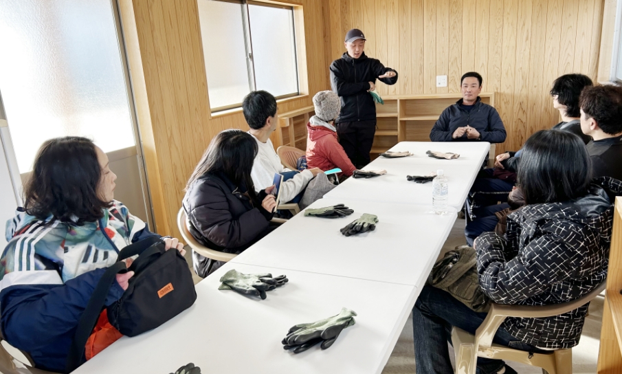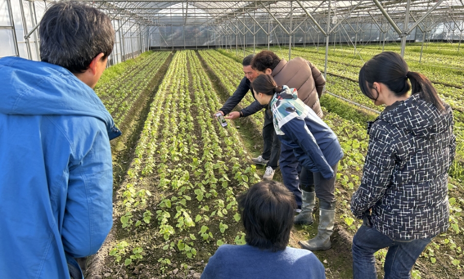 2日目は、伊藤氏が営む「アグフィールド」にて、葉わさびの栽培研修に励みました。冷涼な環境を好む葉わさびの特性や栽培のポイントを座学で学んだ後、ハウス内での定植や、冬の寒さから守るための「トンネル設置」などの実作業に挑戦。一つひとつの苗を丁寧に扱い、成長を見据えた環境づくりを体験することで、作物の繊細な管理技術を肌で感じることができました。