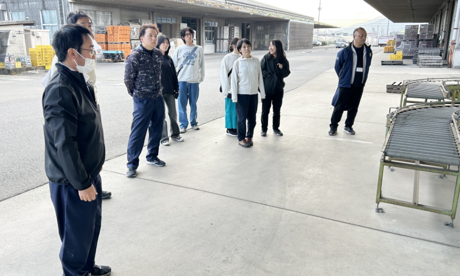 11月の西条研修は、伊予西条駅での集合からスタートしました。初日のメインプログラムは「JA周桑」での視察研修です。営農管理研修センターにて、新規就農者を支える研修生制度やJAの役割について講義を受け、地域全体で農家を支える仕組みを学びました。さらに選果場では、きゅうりや里芋がどのように集荷・選別され、市場へと届けられるのか、その徹底した品質管理の現場を視察。個人農家の努力が組織の力で価値へと変わるプロセスを目の当たりにし、研修生は産地としての強みを再認識する1日となりました。