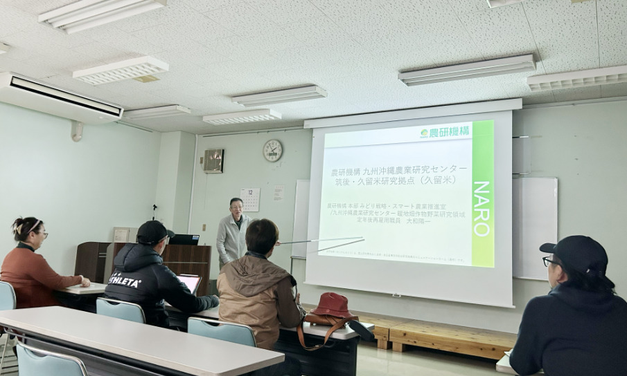 研修のスタートは、西鉄久留米駅への集合から始まりました。初日の研修は、久留米市にある「農研機構 九州沖縄農業研究センター」の視察です。日本の農業技術の発展を支える研究現場を訪問し、最新の栽培技術や品種開発についての説明を受けました。研修生たちは、日々進化する農業科学の重要性を改めて認識し、自身の目指す農業のあり方をより広い視点で見つめ直す、貴重なインスピレーションを得る時間となりました。